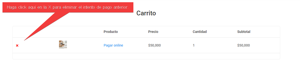 Carrito Your cart is currently empty. Return to shop CÓMO ELIMINAR UN INTENTO DE PAGO: sólo debe hacer click en la X tal como lo indica la imagen a continuación.